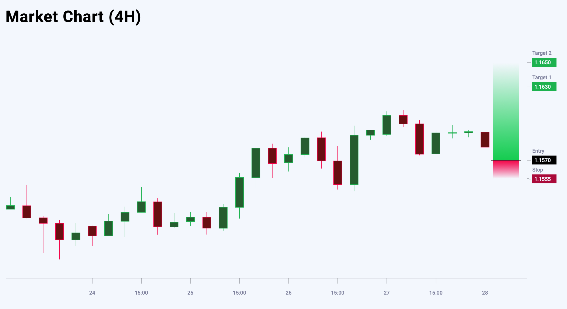 Market sentiment for EURUSD shows a bearish bias – 55% vs 45%. The risk-to-reward ratio is 1:5. Potential profit is 60 pips at the first take-profit target and 80 pips at the second, with possible losses capped at 15 pips.