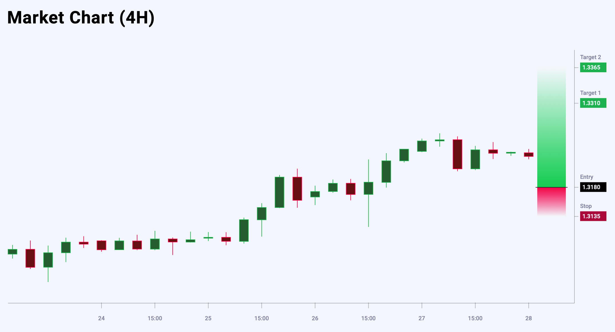 Market sentiment for GBPUSD indicates a bullish bias – 54% vs 46%. The risk-to-reward ratio exceeds 1:4. Potential profit is 130 pips at the first take-profit target and 185 pips at the second, while possible losses are limited to 45 pips.