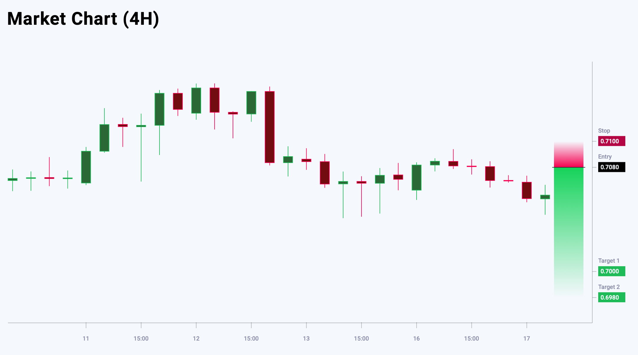 Although bulls continue to control AUDUSD, the slowdown in upward momentum signals a potential trend reversal. The price appears to be forming a local top. The optimal strategy is to sell on price increases. Rallies are expected to be limited by yesterday’s high, while the key resistance level is located at 0.7080. The AUDUSD trade idea for today suggests placing a pending Sell Limit order.