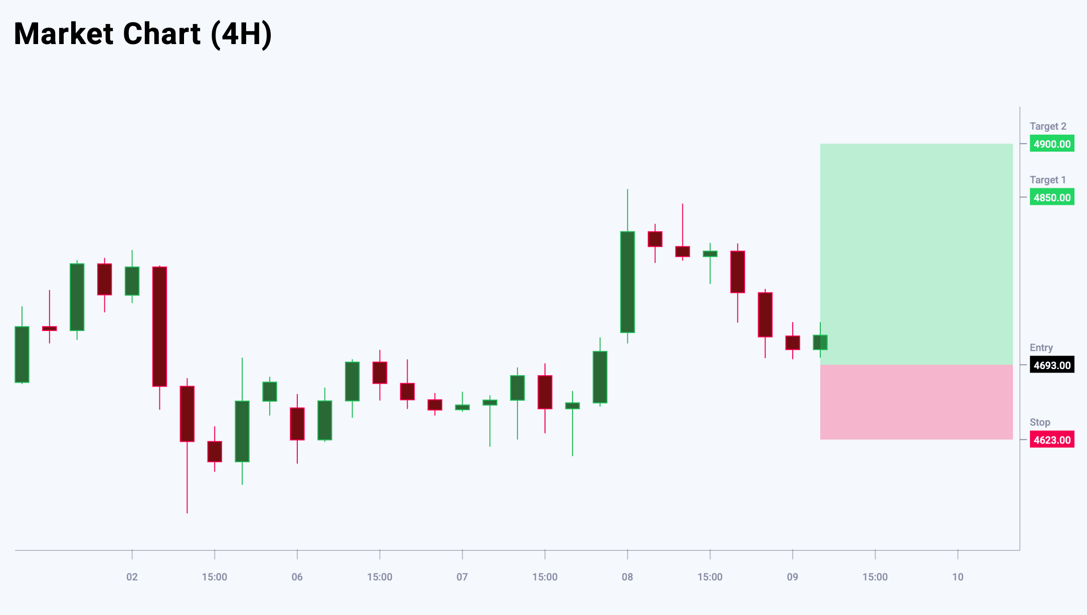 The key resistance level in XAUUSD is located at 4,850 USD, where sellers have previously shown activity. The formation of a Rising Wedge pattern signals the possible exhaustion of bullish momentum. This pattern often precedes a corrective decline, especially when momentum weakens. The key support level is located at 4,693 USD, where demand may emerge and limit the downside. Today’s XAUUSD trade idea suggests placing a pending Buy Limit order.